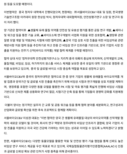 서울바이오C&V, 중국 '정주대학교 안전성 평가연구소'와 비임상 협력 MOU…한중 신약개발 지원 본격화 < 보건·건강·의학 < 사회 < 기사본문 - 한국투데이