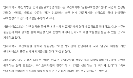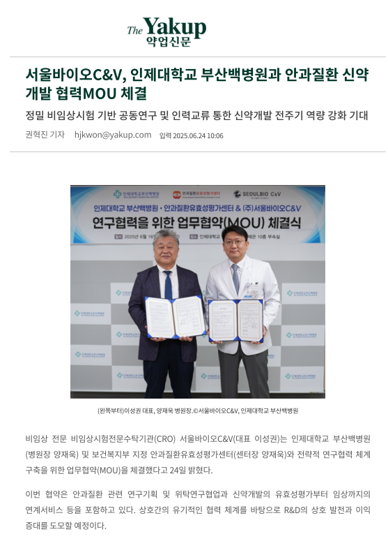 [약업신문]서울바이오C&V, 인제대학교 부산백병원과 안과질환 신약개발 협력MOU 체결