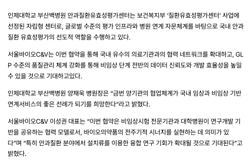 서울바이오C&V, 인제대학교 부산백병원과 안과 신약개발 MOU 체결
