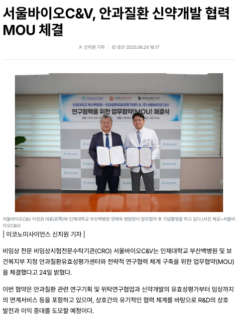서울바이오C&V, 안과질환 신약개발 협력 MOU 체결 < 제약&바이오 < Industry < 기사본문 - 이코노미사이언스