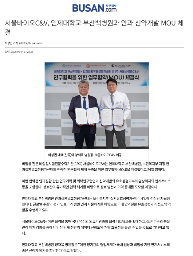 서울바이오C&V, 인제대학교 부산백병원과 안과 신약개발 MOU 체결 - 부산일보